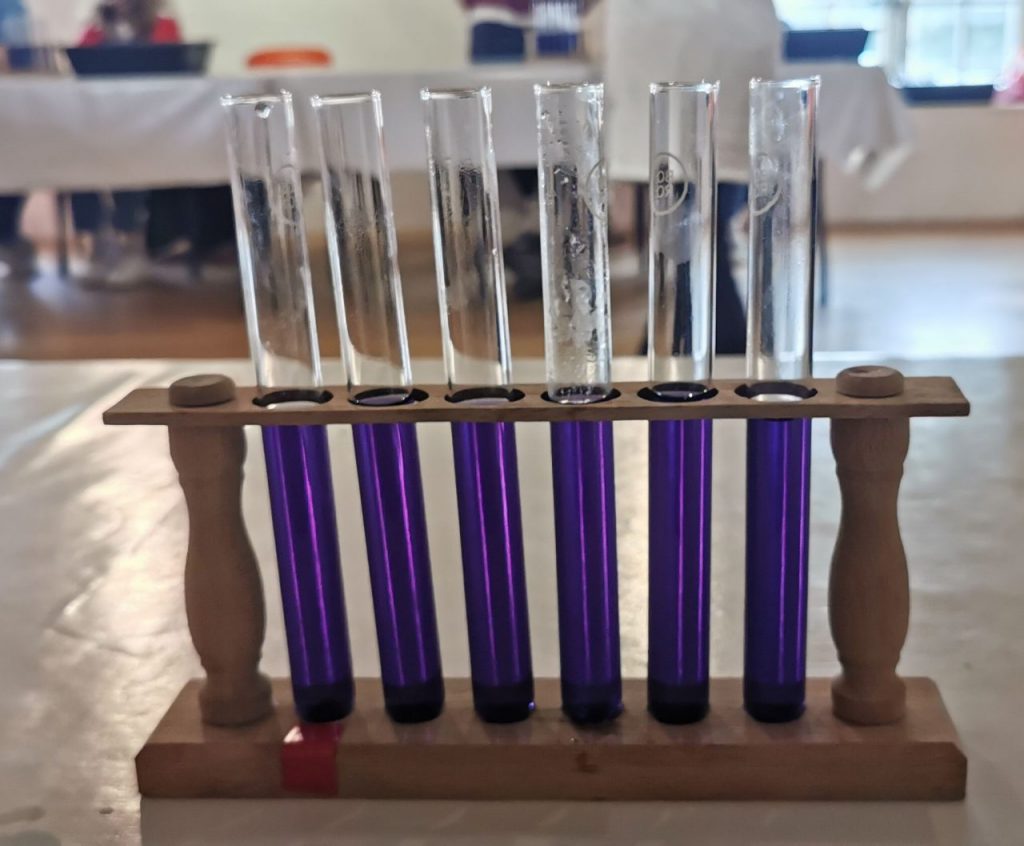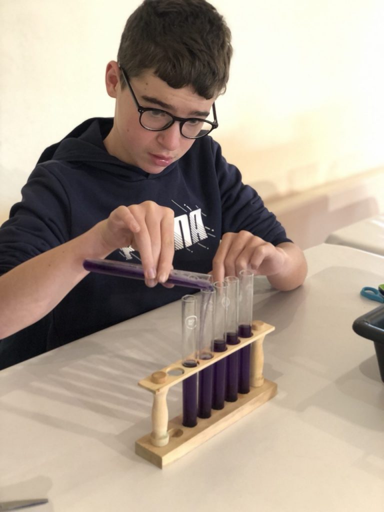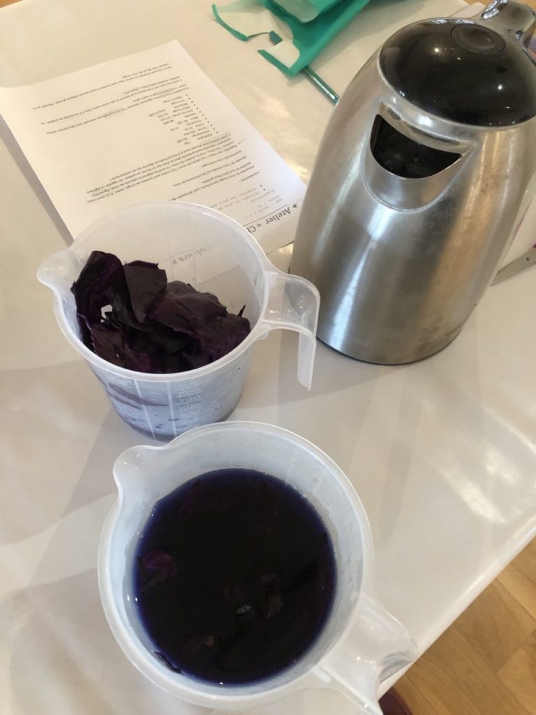 Le chou a ensuite été mis à infuser dans de l’eau bouillante afin de réaliser une solution colorée avec laquelle chaque binôme a rempli ses six tubes à essais.