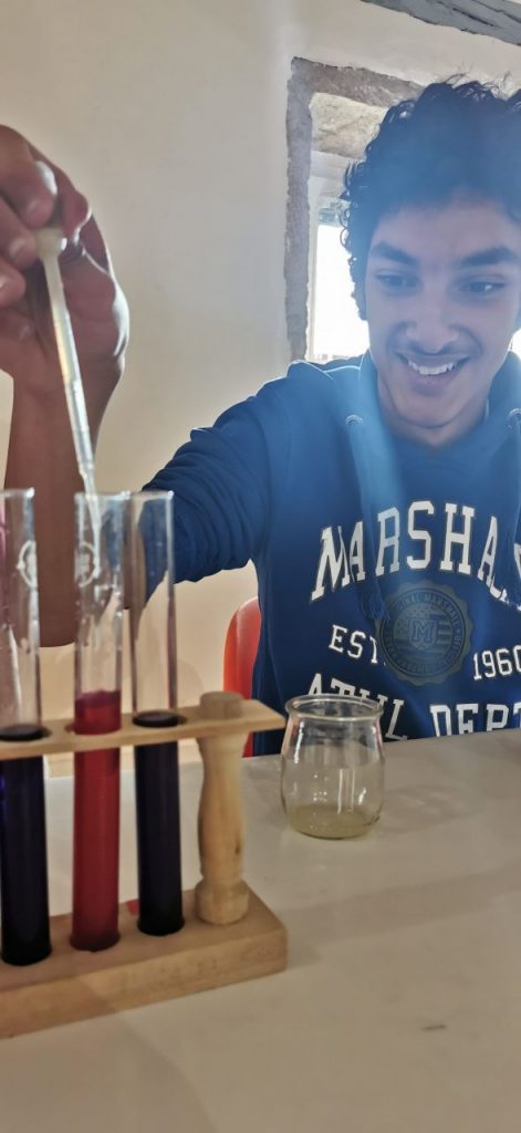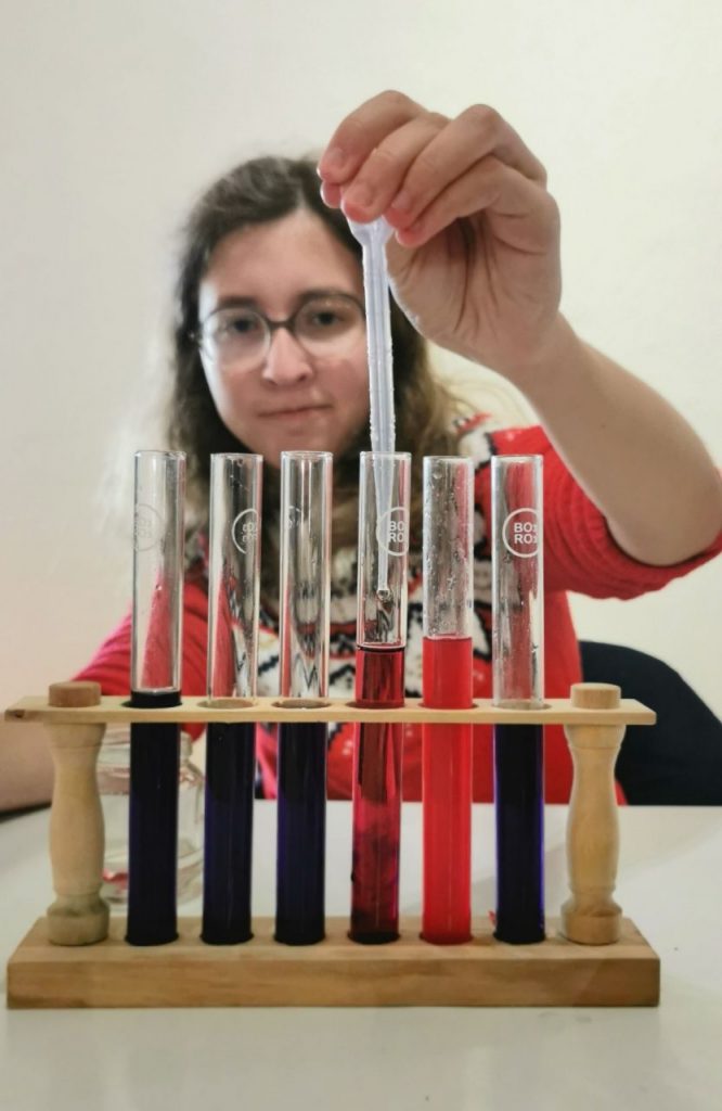 Nous ne mettons rien dans le premier tube: c’est l’échantillon témoin. Les élèves ont commencé par verser du jus de citron, de couleur jaune, dans le deuxième tube à l’aide d’une pipette. Ils obtiennent immédiatement une belle couleur rose.