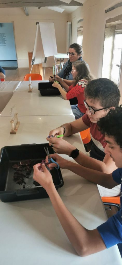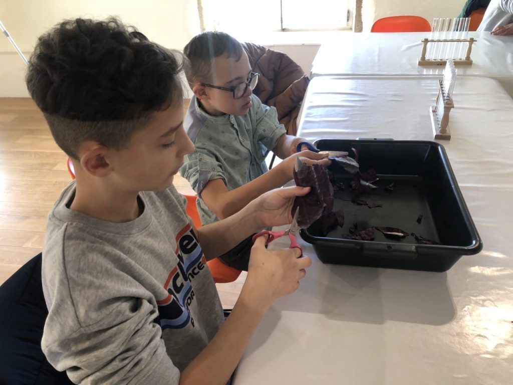 En premier lieu les élèves ont découpé des feuilles de chou rouge.